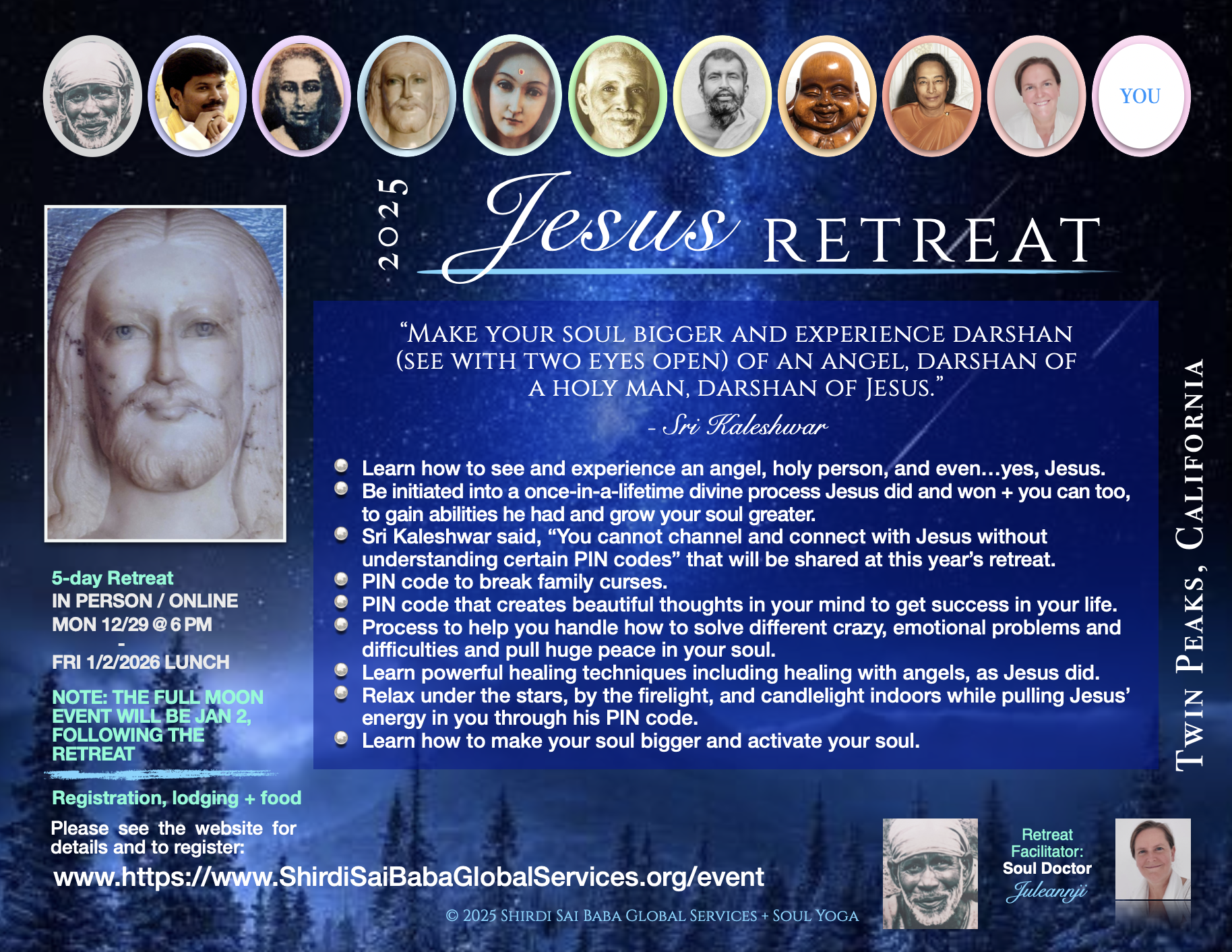 Bloom your soul and directly experience what Jesus, Shiva + the top divine enlightened masters knew and taught. Join us for Master classes, meditations on moons, Soul Healing, retreats and more.