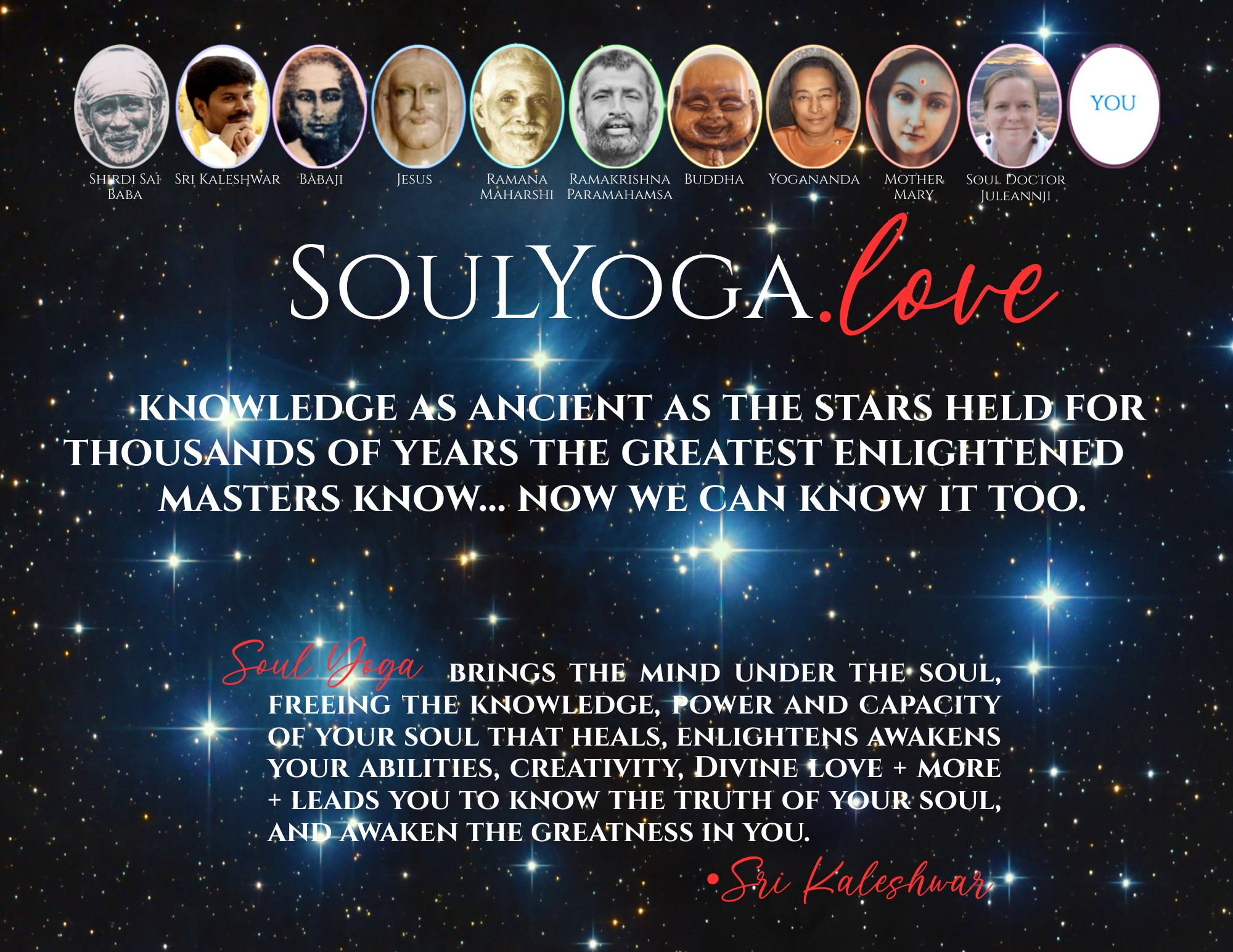 Great masters including Shirdi Sai Baba, Jesus, Sri Kaleshwar, Mother Mary, Mary Magdalene, Buddha, Babaji, Ramana Maharshi, Ramakrishna Paramahamsa, Paramahansa Yogananda and more mastered these Soul Yoga meditations...you can do it too.