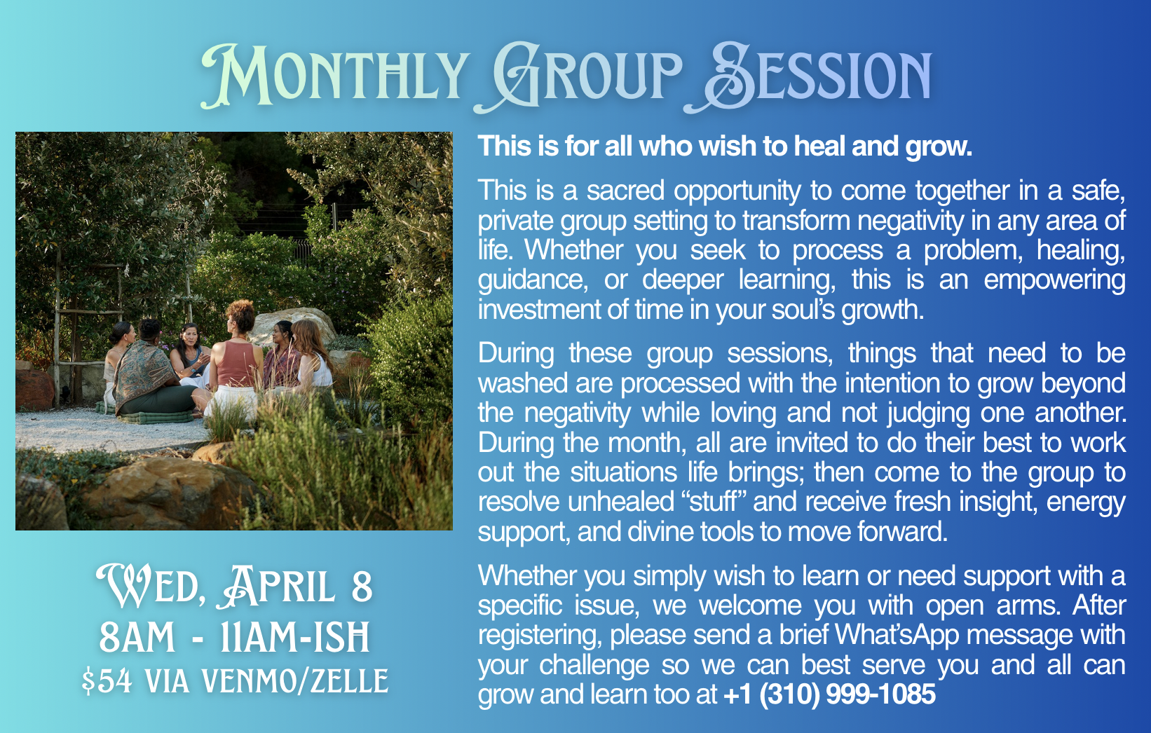 One healing technique to wash pain and suffering is to speak the truth of your feelings with your soulmates or the person you hurt/who hurt you. This is a group session where we do just that and "get real" and loving. We honestly and openly share and process unhealed "stuff" to be free. See our newsletter for more details to join us and register.